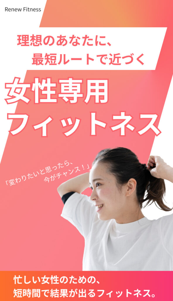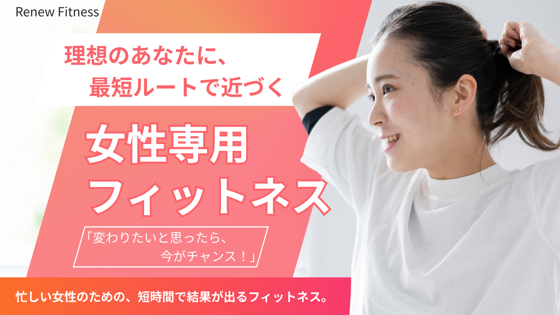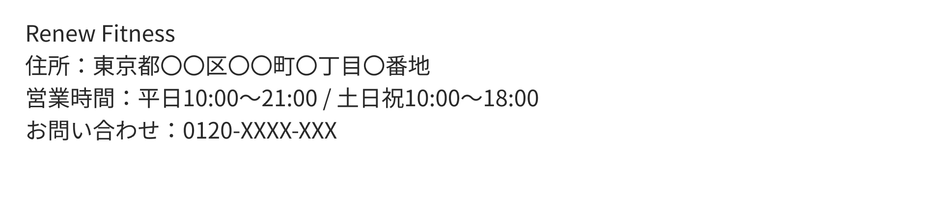 Renew Fitness住所:東京都〇〇区〇〇町〇丁目〇番地営業時間:平日10:00〜21:00 / 土日祝10:00〜18:00 お問い合わせ:0120-XXXX-XXX FacebookXBlueskyHatenaPocketCopy